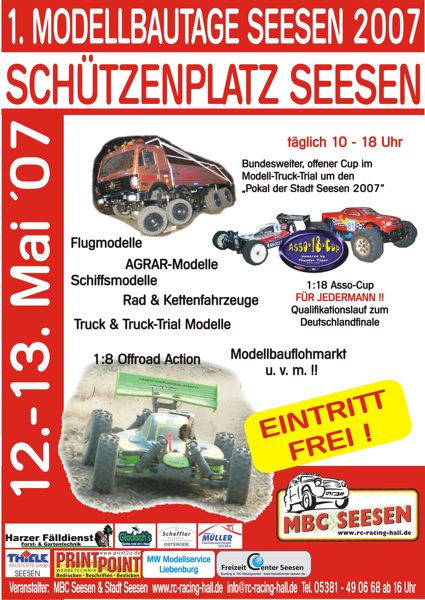 Im den Bereichen "Offroad 1:8 Nitro" und "Truck-Trial" wird an dem Wochenende der Cup um den "Pokal der Stadt Seesen" ausgefahren. Ebenso wird es einen Qualifikationslauf des Asso-18-Cup-2007 zum Deutschladfinale geben.