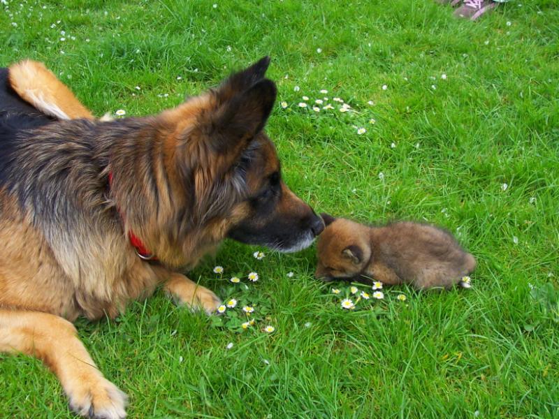 Unsere Schäferhündin bekommt schon Muttergefühle, ich glaube sie wird die kleine annehmen.
