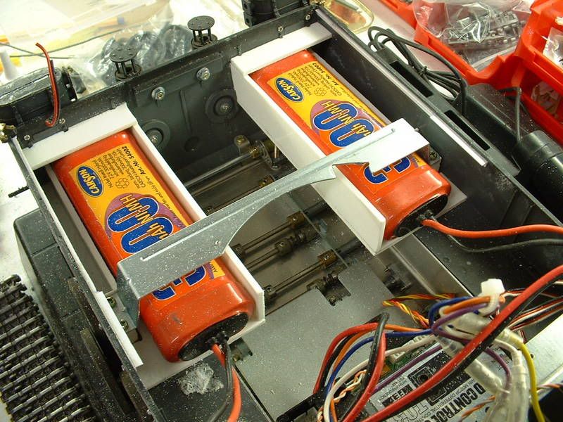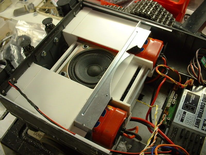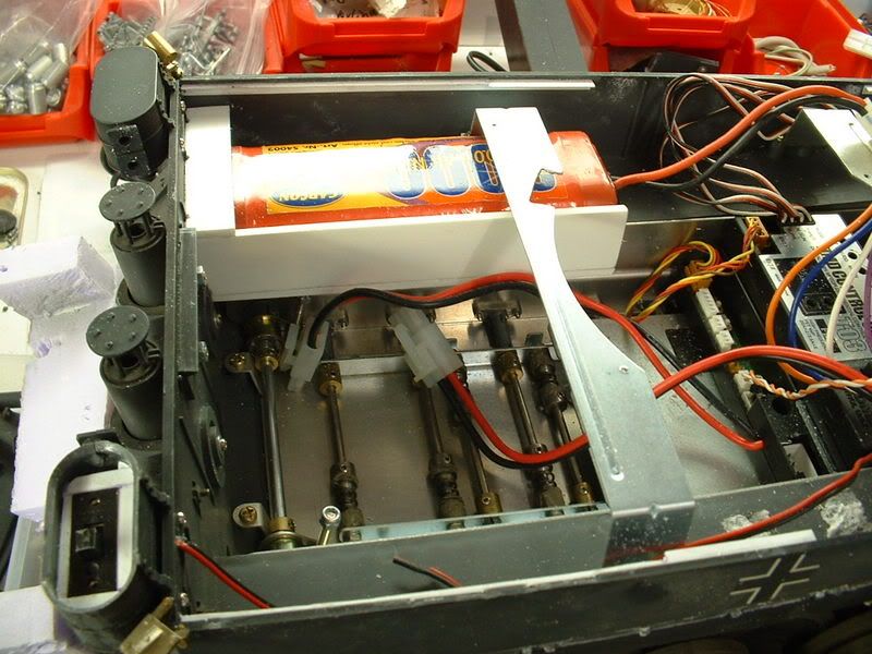 Die Akkus waren mir immer im Weg , also neuer Standort und dazwischen wird jetzt ein Lautsprechergehäuse gebaut , mit Resonanzöffnung zur Grätting. Aber alle Schrauben vom Fahrwerk sind noch erreichbar.