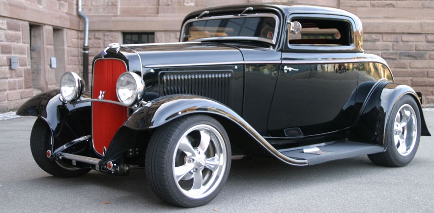 Es handelt sich um einen 32er Ford 3-window-coupe. Original Rahmen, und Haube, der Rest ist aus Gfk. Ferner besitzt er bereits einen extra angefertigten Auspuff aus Edelstahl, Jaguar Hinterachsen und Air Ride. genügend dampfbekommt das Teil aus einem 350er smal Block mit rund 400PS. Genau das richtige um sich über die wintermonat in der Garage damit aus zu toben