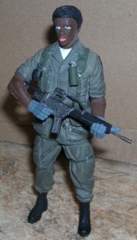 Der erste von den Typen heißt Joshua. Er ist überwiegend aus Komponenten der Verlinden-Figur "82nd Airborne" gebaut, der Kopf ist von den Character Heads. Er ist noch nicht ganz fertig. Die Uniform soll ein Südostasien-Tarnschema bekommen (dunkelgrün-mittelgrün-schwarz). Mit der Gesichtsbemalung muß ich sicher auch noch ein bißchen üben...