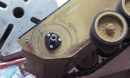 AFV orientierte sich bei der Konstruktion der Nachrüstwanne für den Abrams ganz offensichtlich an den alten Tamiya-Bausätzen für die Leo I. Dort wurde der ganze Antriebsblock am Stück von oben eingesetzt, was Schlitze in den Seitenwänden für die Treibradachsen erforderte. Die beiden einzelnen Tamiya-Getriebe für den Abrams werden nach AFV-Vorgabe zu einem ähnlichen Block vereinigt und gegeneinander abgestützt. Nach Einbau schließen kleine Einschubplättchen die Schlitze über den Treibrädern. Ich habe schon beim ersten Zusammenbau noch einen Abschnitt außen aufgeklebt, um eine Fläche in der Seitenwand zu bekommen und dadurch eine Dreckfangecke auszumerzen. Nun wollte ich noch den (zugegebener Maßen kleinen) Spalt um die Treibradachse dicht haben. Hier fielen mir zwei Kugellager mit Teflondeckscheiben in die Hände, die beim Kauf für etwas anderes gedacht waren - aber egal. Diese hatten genau die richtigen Abmessungen. Ich wollte zwar Dichtheit, aber keine regelrechte zusätzliche Achsabstützung - mit einer Kunststoffwanne sollte das ganze bei Belastung etwas "arbeiten" können. Daher fertigte ich aus Hartgummistücken Aufnahmen an, die mittels dreier M2 Schräubchen auf die Wanne montiert werden und die Lager flexibel aufnehmen.