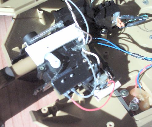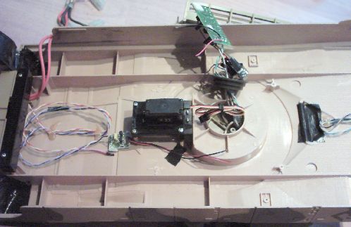 Die Elektrik mußte ich nur leicht modifizieren. Die Zuleitungen zum Turm laufen alle über eine 9-Polige Sub-D Steckverbindung. Die beiden Leitungen, die bisher den Turmdrehmotor versorgten übernehmen den Job der Lautsprecherversorgung, eine noch freie Leitung bekommt Dauer-Minus für den Rohrrückzug. Das Turmdrehservo wird hingegen direkt mit dem Empfänger verbunden, was zwar den 1-Stecker-Aufbau hinfällig macht, aber irgendwo isses nun mal auch gut.