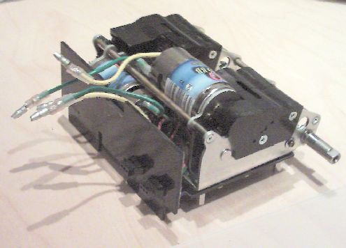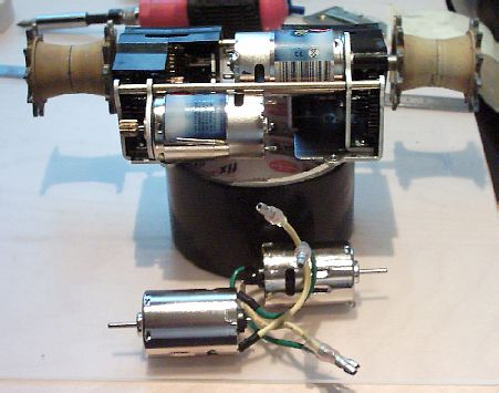 Der Getriebeblock. Die vorsorgliche Modifikation der Zahnräder am Endantrieb hat sich bewährt. Kein Spiel. Wenig Schmutz in den Getrieben, diese liegen modellspezifisch wesentlich geschützter als z.B. die exponierten KöTi-Antriebe. So sind die Getriebe fit für das Motortuning. Um die Geschwindigkeit zu erhöhen, setze ich bewährte Jamara HS 480 Pro BB ein. Diese Dinger sind billig und drehen 22000 Touren an 7,2 V, was etwa 5-6000 mehr sein sollten als die originalen Johnson 380er. Die neuen Kraftquellen sind etwas größer als die alten und passen grade eben so. Rundum sind nur noch wenige 1/10 mm Platz. Vor dem Einbau habe ich die Heißsporne schön einlaufen lassen.