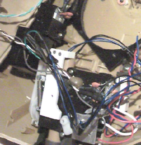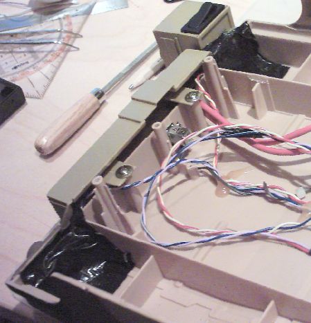Der Kunststoffträger mußte "Feuerwandseitig" noch mit zwei Durchbrüchen versehen werden, dort habe ich die Stecker für den Abgriff der Motorspannungen integriert. Das Beier-Soundmodul richtet sich nicht nach den Signalen des Empfängers, sondern arbeitet noch mit den Spannungen. Ich hoffe den Kabelsalat dadurch etwas eleganter drappieren zu können.