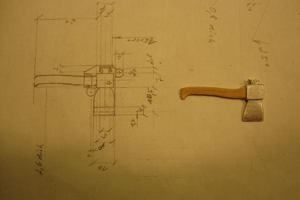 Dann ist als nächstes das Beil dran. Zuerst mal solo. 4mm Alublech, mit der Laubsäge ausgesägt, mit 2mm Fräse Langloch für der Stiel erstellt, Holzstiel hergestellt - einpressen - fertig - 3 Stunden futsch.