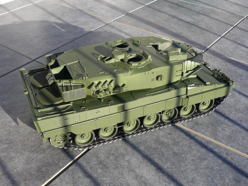 Ich habe den Leo mit Tamiya Grundierung (die hellgraue) vorbehandelt und danach mit Tamiya TS-61 (Nato Oliv) Sprühfarbe lackiert. Ein Bekannter, der eigentlich alles mit der Airbrush macht, war von meinem Lackierergebnis doch sehr überrascht. Aber beim Sprühdosen-Lackieren ist halt noch mehr Geduld gefragt. Es waren glaube ich bei der Oberwanne ca. 7 - 8 Lackierdurchgänge, bis wirklich alles in schön sattem Oliv erstrahlte.