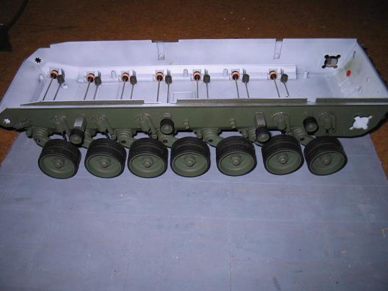 Bei der Leo2 Unterwanne bau ich alles dran, was halten muß und nicht geschraubt wird- sprich Halter der Stützrollen und Dämpfer. Die Kolben der Dämpfer umwickele ich mit Klebeband, damit sie blank und beweglich bleiben. Die hinteren Details der Wanne (Leitkreuz usw....) nicht vergessen. Dann lackier ich die komplette Unterwanne von aussen. Schwingarme und Laufrollen lackiere ich als Einzelteile bevor die Laufrollengummis drauf kommen. Wenn alles gut trocken ist zusammenbauen. So hält alles und die Funktionalität bleibt erhalten. Die Laufrollen lackiere ich nur "von aussen", so kommt auch kein Lack an die Lagersitze.