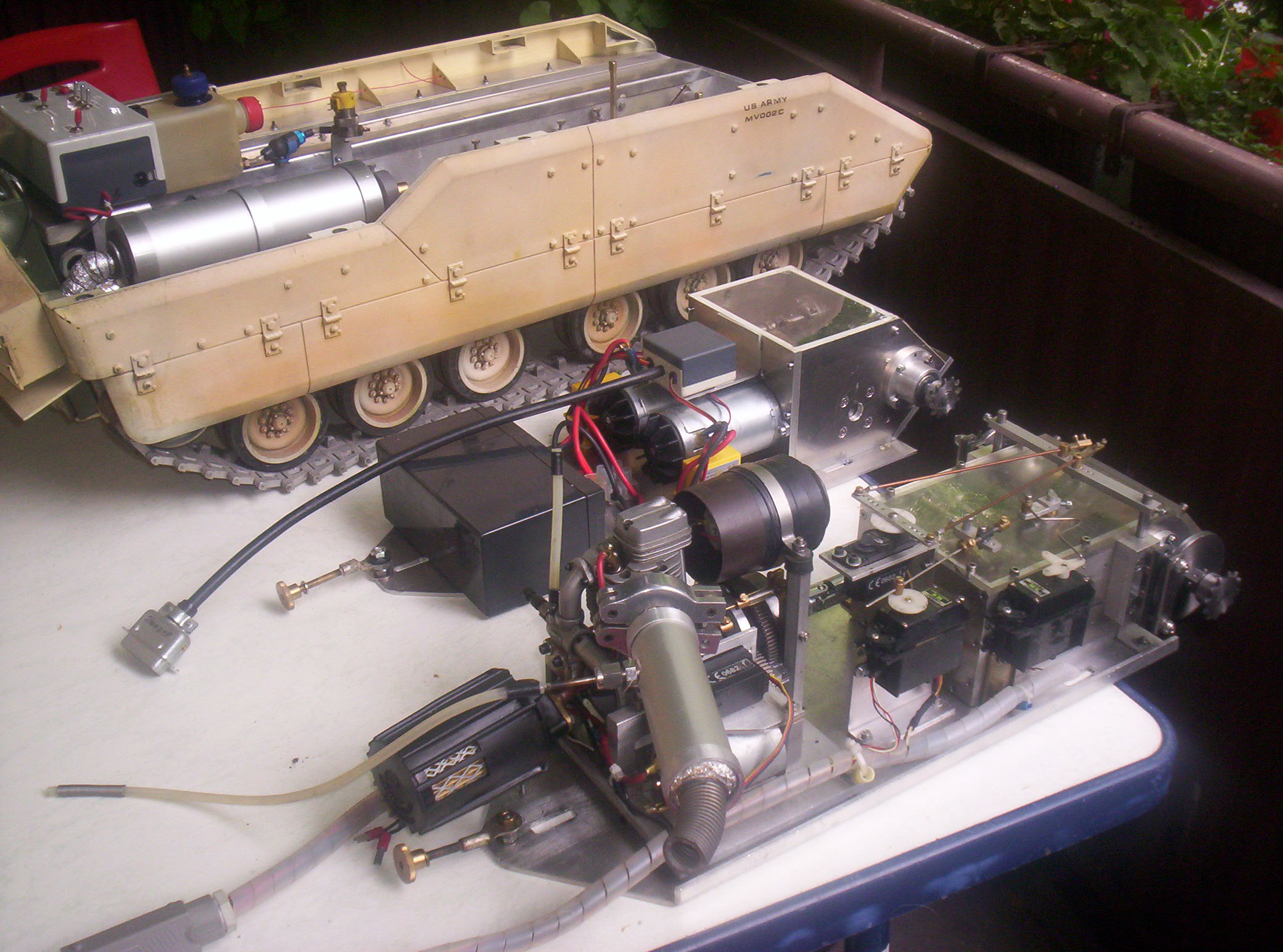lösen können, aber Platz hab ich im Bradley nicht mehr, obwohl 1/6. Außerdem kannst du sowas nicht daheim am Küchentisch herstellen. Wenn du berufsmäßig nicht die Gelegenheit hasst, eine komplett ausgerüstete Feinmechanikerwerkstatt zu haben, würde ich sagen, dein Vorhaben ist zum Scheitern verurteilt. Überleg mal, was du allein an Drehteilen für die Kupplung, Anlasser und Getriebe mit Rückwärstgang brauchst. Ich habe beim Verbrennermodul im Bradley allein 2 mal 12 Volt Akkus für die