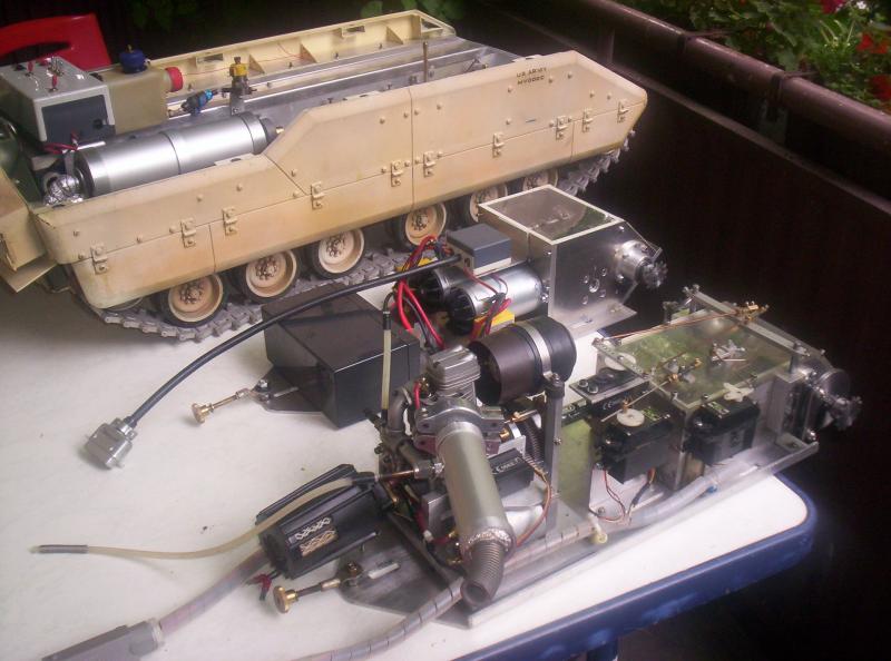 ich selbst habe einen Bradley 1/6 mit 15ccm 4Taktmotor gebaut. Ich habe alle auftretenden Probleme