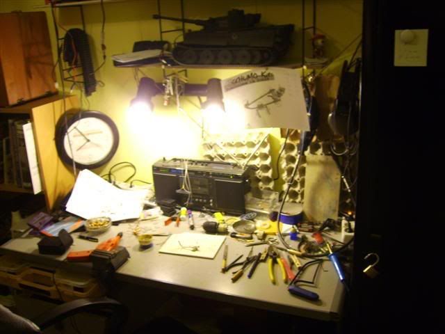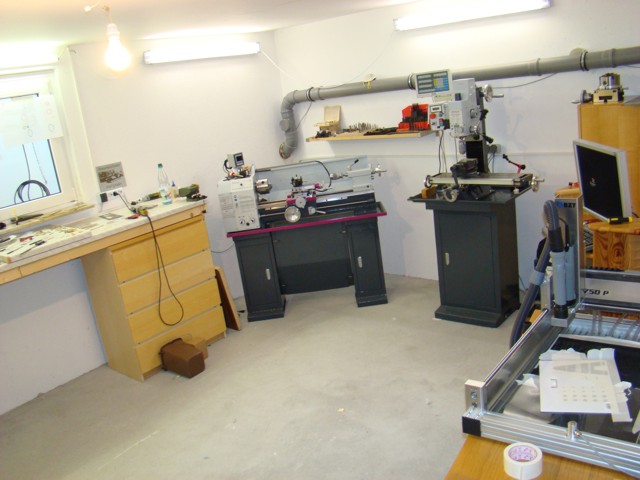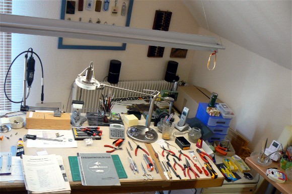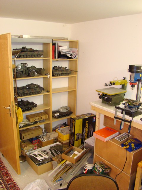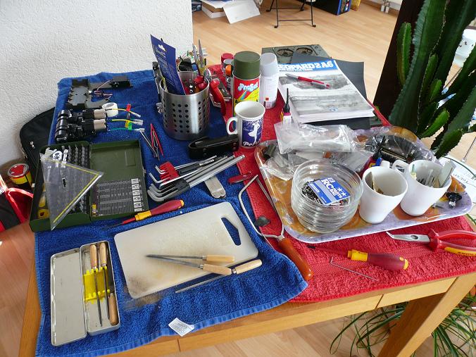 da ich keinen speziellen Bastelraum habe bin ich gewissermaßen gezwungen am Ende des Basteltages einigermaßen Ordnung zu machen d.h. alle Feil-,Schleif- und Frässpäne werden entfernt aber das Werkzeug liegt weiterhin auf dem Tisch auf einem extra Holzbrett sauber nebeneinander aufgereit (so sieht es zumindest am Anfang und am Ende der Bastelschicht aus,wie es dazwischen aussieht möcht ich besser nicht erwähnen)
