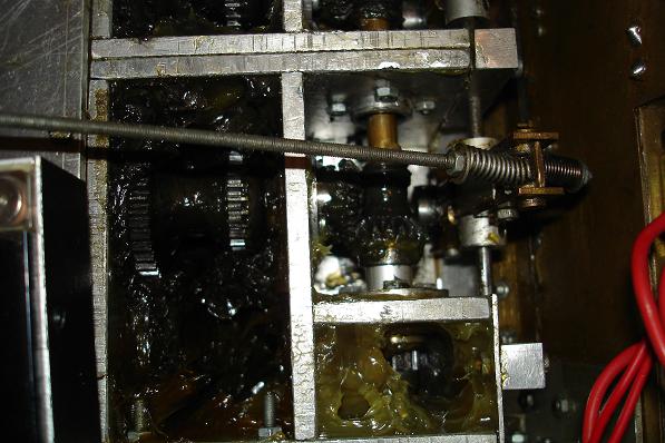 Nun mal zwei Bilder von meinem Getriebe. Alles ziemlich grob, aber es hält.Unter den Fahrtreglern sitzt eine Reduzierung. Diese Zahnräder sind in der Breite so ausgelegt, daß der Schaltweg abgedeckt ist. Hier greift die untere, in Längsrichtung zu verschiebende Schaltwelle ein. Auf dem Zweiten Bild sieht man im Kasten zwei größedre Zahnräder, welche im Fett laufen. Darunter befindet sich die Schaltwelle, Mittelstellung = Leerlauf. Hoffe das ist einigermaßen verständlich. Alles weiter in Sinsheim/Dortmund/Munster.