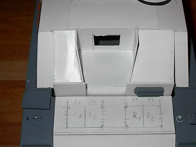 Anpassung der Geschützpforte , dabei mussten die orginal Getriebe etwas bearbeitet werden ,der obere Motor wurde etwas nach unten gesetzt und somit konnte ich etwa 6 mm einsparen , dies wurde durch die abgestufte Platte im unteren Teil retuschiert .