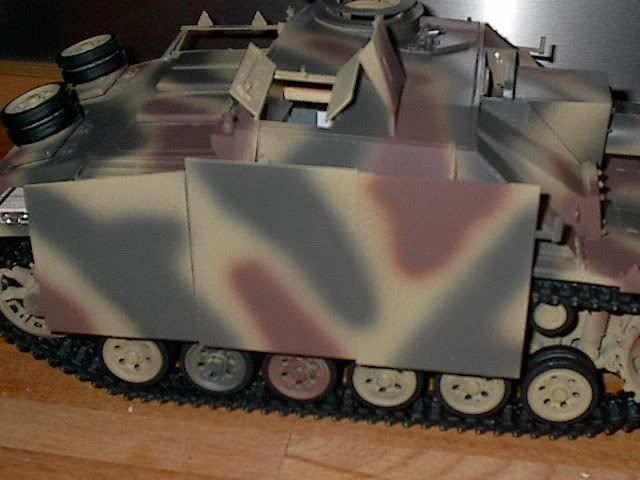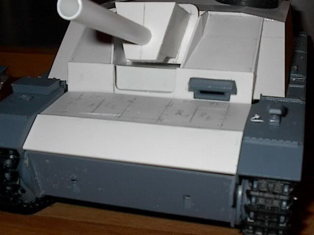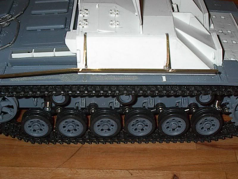 Es wurden nun die seitlichen Halterungen für die Schürzen und die Frontzusatzpanzerung der Kasematte angebracht bzw feriggestellt .