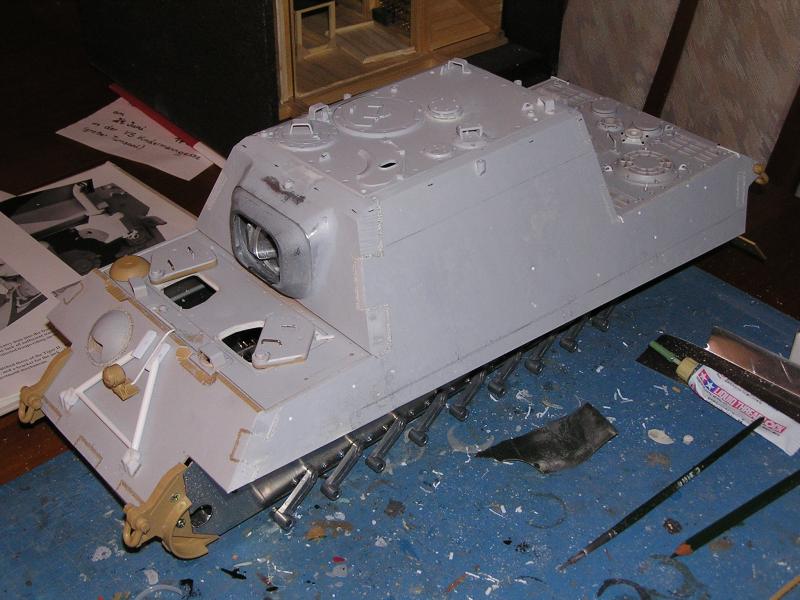 Hallo Sdkfz171, auch ich hatte mir damals den Jagdtiger "the hard way" gebaut. DenTurm aus schweren dicken Resinguss. Lediglich die Kanone und Blende hatte ich zugekauft. Hatte auch das Vordach gesenkt. Zwischen 2,5 und 3 mm sollte es passen. Abei mal ein par pics zur Ansicht. Weiter so! Gruss Martin