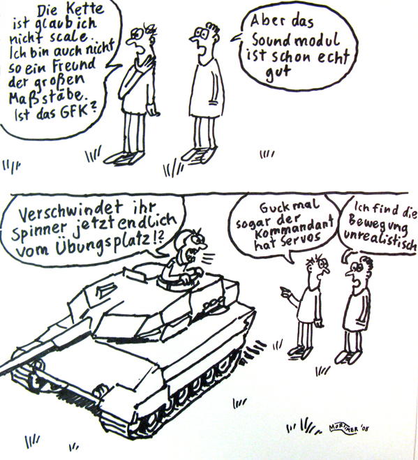 ich beschäftige mich nun seit gut 20 Jahren mit Modellbau und davon ca. 7 Jahre mit Panzern in 1:8 und 1:10 sowie 1:87. Soviel mal dazu um deine Neugier zu befriedigen