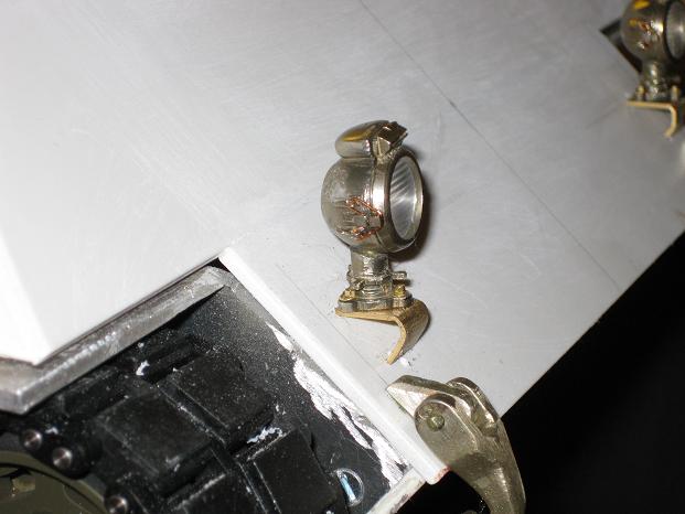 bei 1:10 kommt "Mann" immer vom Ast zum Stöckchen..... wenn man es gut machen möchte. Hier die modifizierten "AFV" Scheinwerfer (sind ja für den Leo2, also geht der Sockel nach hinten raus). Die Sockel abgetrennt, neue Löcher gebohrt, die Aufnahme für den Reflektor (einer fehlt auf den Bildern, vergessen...) nachgefeilt.... dann die Drähte zugefügt um wie im Original die Scheibe mit Rahmen zu befestigen. Genau wie bei meinem "Pio".