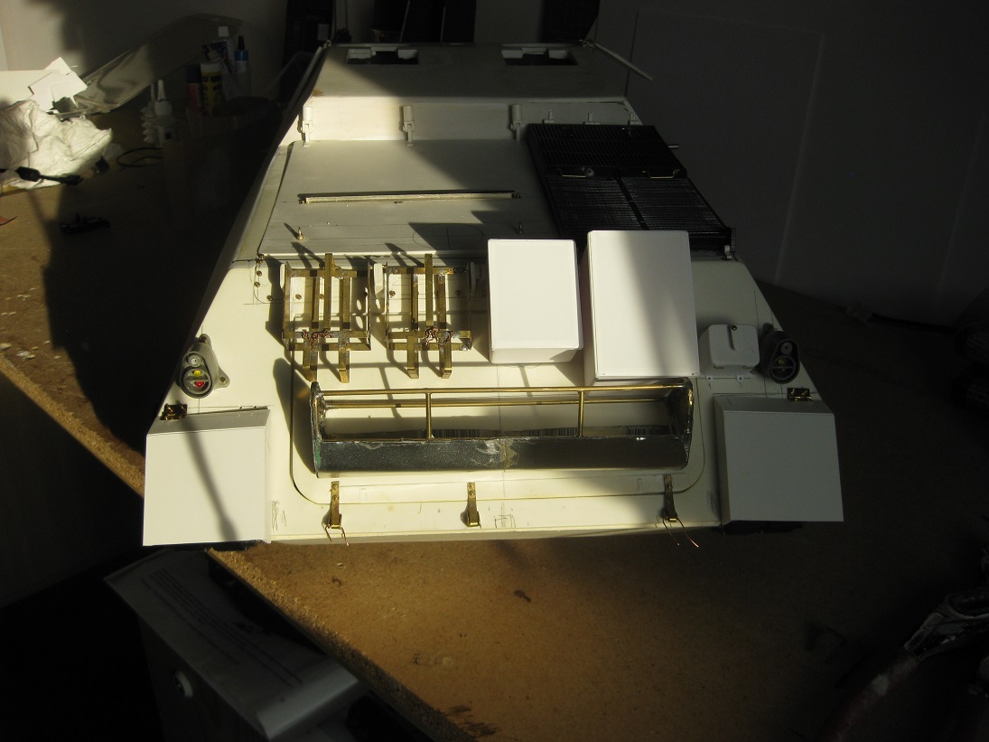 ....... dieses Mal musste ich das begonnene Modell erst ordentlich entstauben..... die Kante zwischen Motorraum/ Heck und Kasematte wurde senkrechter gestellt (stimmt, passte gar nicht). Dazu die Ausschnitte zum ausfahren der SS11 Raketen ausgeschnitten. Hier muß ich sagen, Zeichnungen, Bilder zum RaJaPa SS11 sind rar. Da hat das Fotografierverbot wohl noch gewirkt. Und die tollen Gitter der Motorraumabdeckung (nochmal DANKE Christian) versäubert, nachgearbeitet und angepasst.