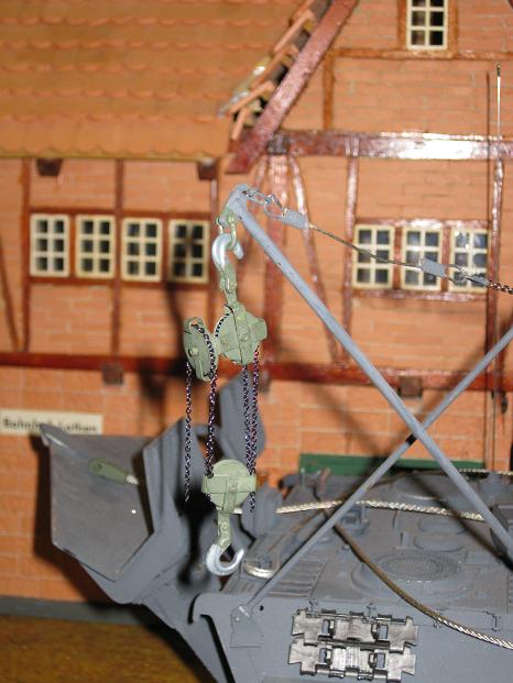 Für Munster Pfingsten hab ich den Bergepanther noch etwas modifiziert. Endlich den Schlepphaken an das Zugseil und einen Flaschenzug für den Kran. Leider fehlte es hier völlig an Vorbildfotos (vom Flaschenzug). Hergestellt übrigens aus Messing. Dazu nochmal die Figuren fixiert und befestigt. So kann er starten....