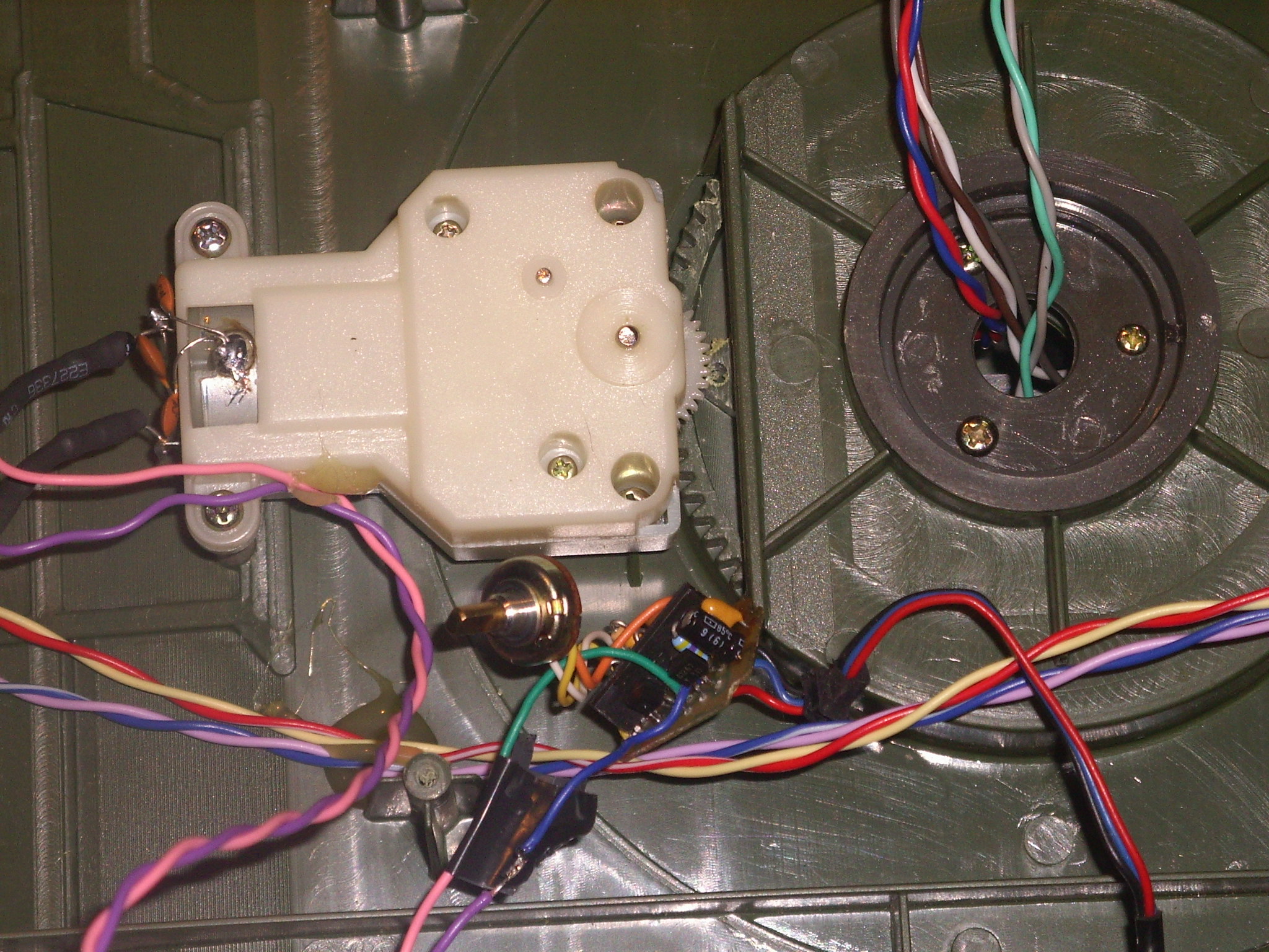 Hallo,ich habe mich jetzt über den Umbau gemacht.Ich habe jetzt eine Lösung gefunden.Ich habe mir heute im Keller ein paar gedanken gemacht,und siehe da es klappt.Also ich habe von einem Starken Volzservo die Elektronik samt Poti rausgebaut und habe es an meinem Arams Turmmotor(zwei Phasenmotor)angelötet.Das Drehen des Turms in beide Richtungen ist ohne Probleme möglich.So werde ich noch Kanone Heben/Senken , Rohrrücklauf Ausstatten.Aber ich möchte gern das vorhandene Poti weg haben,denn wenn ich das Poti drehe dann dreht der Turm selbstständig.Ist so eine Art Trimmung.Kann ich das Rote,Weiße und Gelbe Kabel vom Poti miteinander zusammenlöten?Kennt sich da jemand aus?