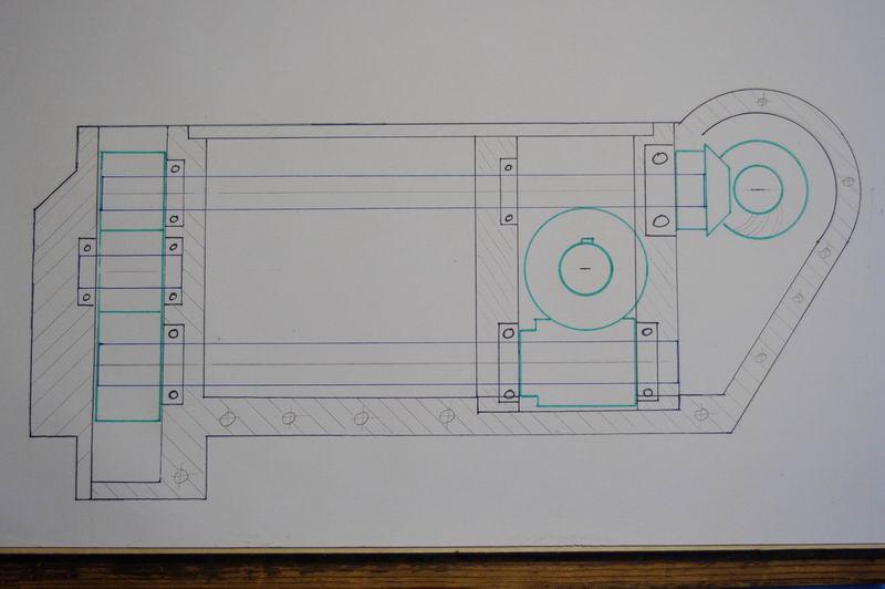 ich habe mal eine grobe Zeichnung des Getriebes erstellt.....mit ein paar Fehlern und so ganz nach Technischem Zeichnen bin ich nicht wirklich vorgegangen, hoffe aber das man sich trotzdem ein Bild von machen kann.