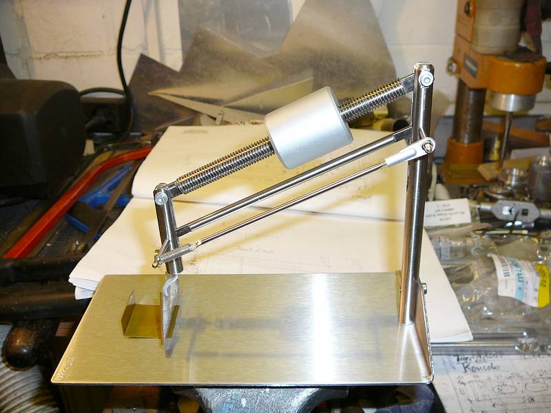 Es handelt sich dabei um ein Parallelogramm mit einem verstellbaren Belastungsgewicht von ca. 100 Gramm. Damit das eigentlich schon geringe Spiel in den Gelenken nicht etwa eine Unsicherheit beim Fixieren der Teile hervorruft, wurde die seitliche, einstellbare Gelenkbolzen-Verspannung erfunden. Damit wird das Gestell völlig spielfrei, bleibt aber gelenkig. Die Spannhöhe geht bis ca. 200 mm.