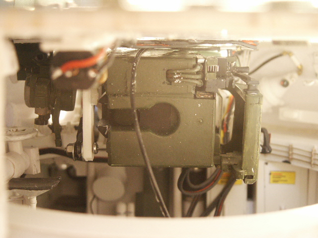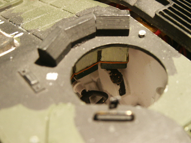 Dadurch,daß ich alle Kabel aus dem Turm in den vorderen Bereich der Wanne legen muss habe ich den seitlichen Richtbereich auf 45° nach jeder Seite begrenzt,so kann ich die Kabel noch als Schlaufe im Kampfraum unterbringen ohne daß Sie zu stark stören.