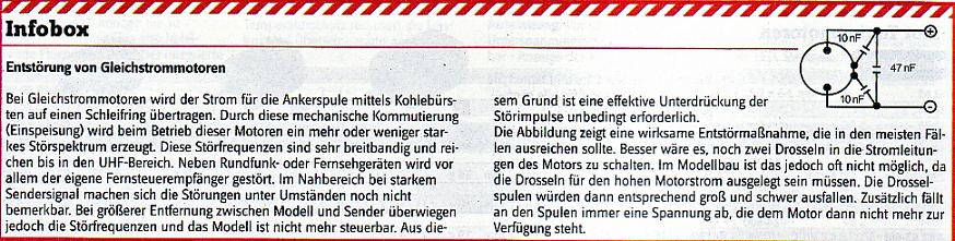ein Entstörfilter direkt am Motor dient dazu, Störimpulse die durch Funkenflug an den Motorkohlen entstehen, nicht in die Motor-Anschlußkabel gelangen zu lassen. Falls dies doch passiert, wirken die Motor-Anschlußkabel wie kleine Sendeantennen und stören dadurch den Empfänger ganz massiv.