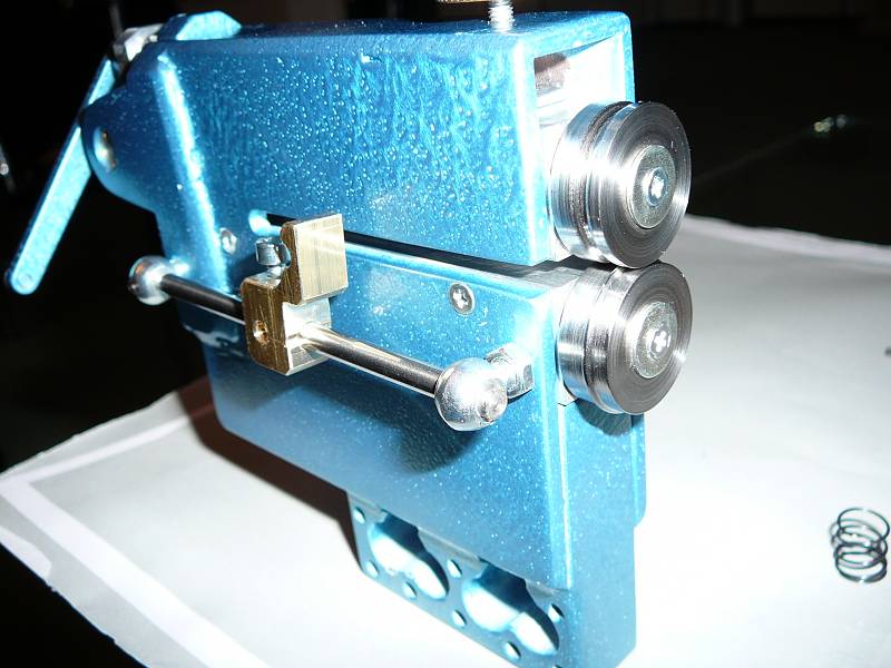 Auf der Vorderseite ist entsprechend eine Schraube angebracht, die mit einem kleinen Rändelrad versehen eine Höhenverstellung der oberen Welle ermöglicht. Auch der evtl. benötigte Druck kann hiermit erzeugt werden.