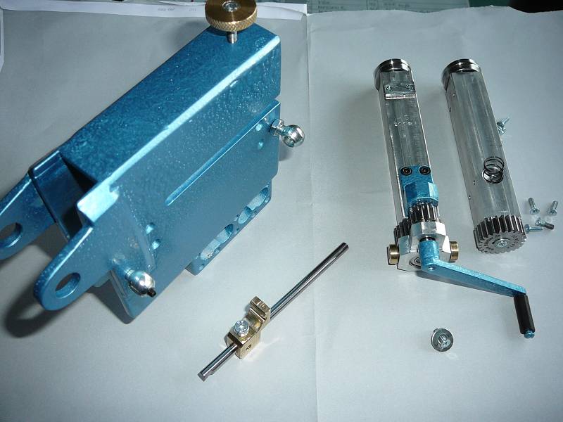 Zum Schluß muß eine Kurbel mit Untersetzungsstufe für den langsamen Antrieb sorgen und zwar so, dass dieser sich mit der oberen Welle schwenken läßt.