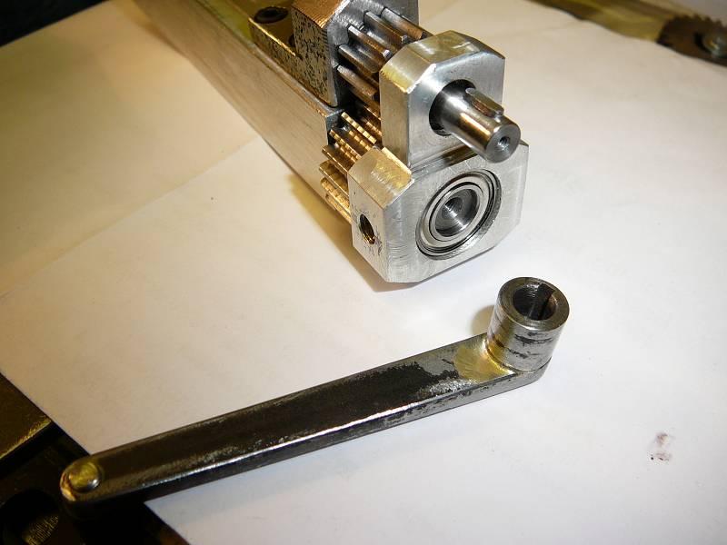 Die Handkurbel wurde ebenfalls aus dem 4mm Stahlblech gefertigt, Dazu habe ich dann eine Buchse für die kleinere Zahnradwelle gedreht und mit einer 2mm-Nut versehen. Anschließend wurden beide Teile hart vertlötet. Ein Handgriff ergab sich aus einer Kunststoffrolle mit einer modifizierten M4-Schraube.