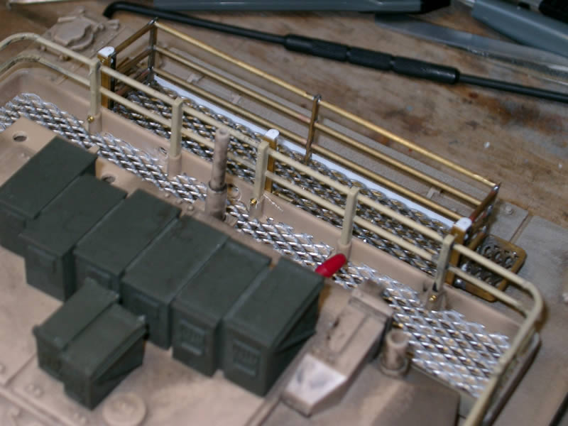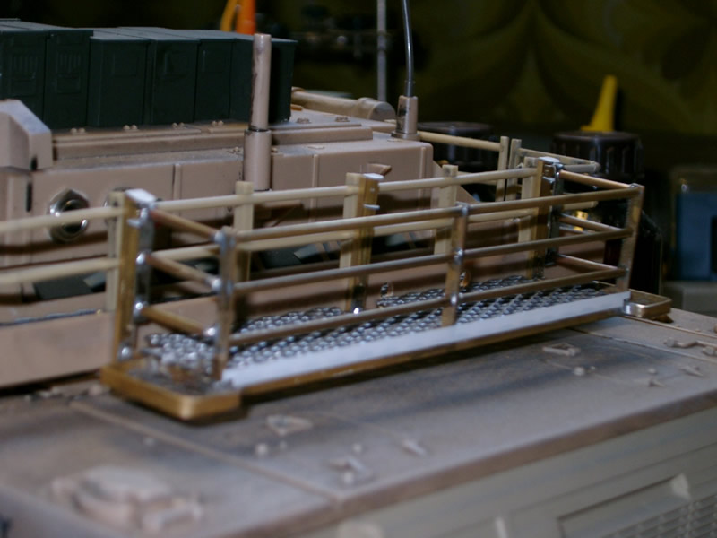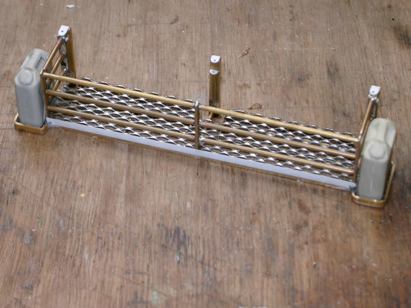 Jetzt ging es los! Fast das ganze Wochenende habe ich an dem Zusatzheckkorb gebastelt, der doch recht trickreich war. Zudem ich als Referenzmaterial lediglich ein paar Bilder zur Verfügung hatte. Dafür aber beinahe komplett aus Metall zusammengelötet. Muss jetzt nur noch ein paar Aufnahmegewinde bekommen (für die ich mir erst mal Schneidsätze besorgen muss), dann etwas Farbe und zwei Verriegelungsbolzen. Aber die kommen ran, wenn er am Panzer hängt.