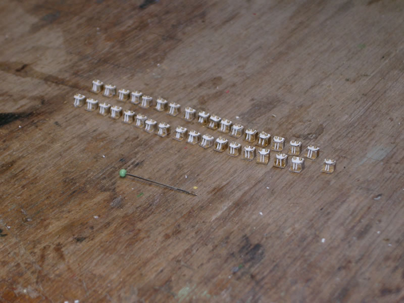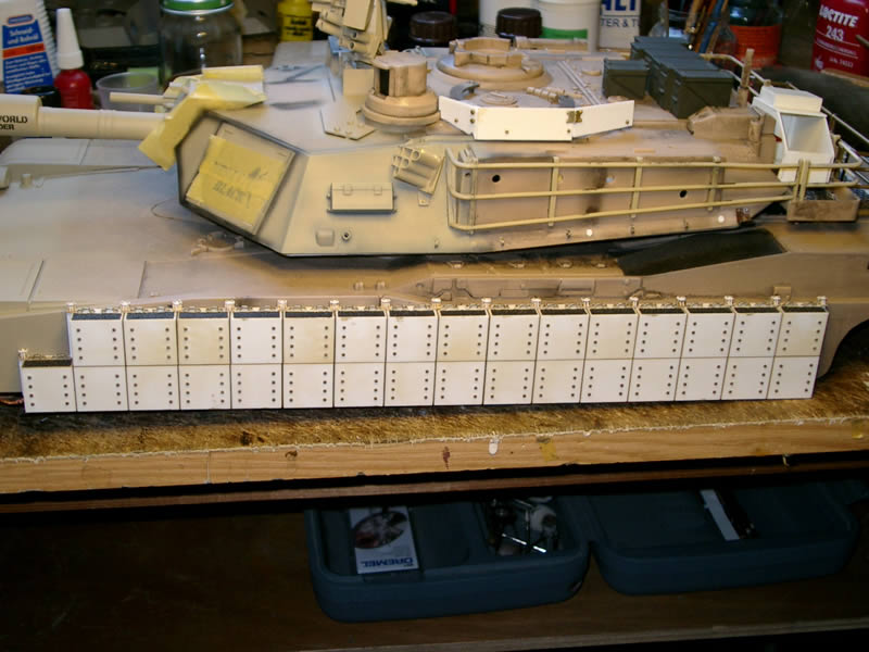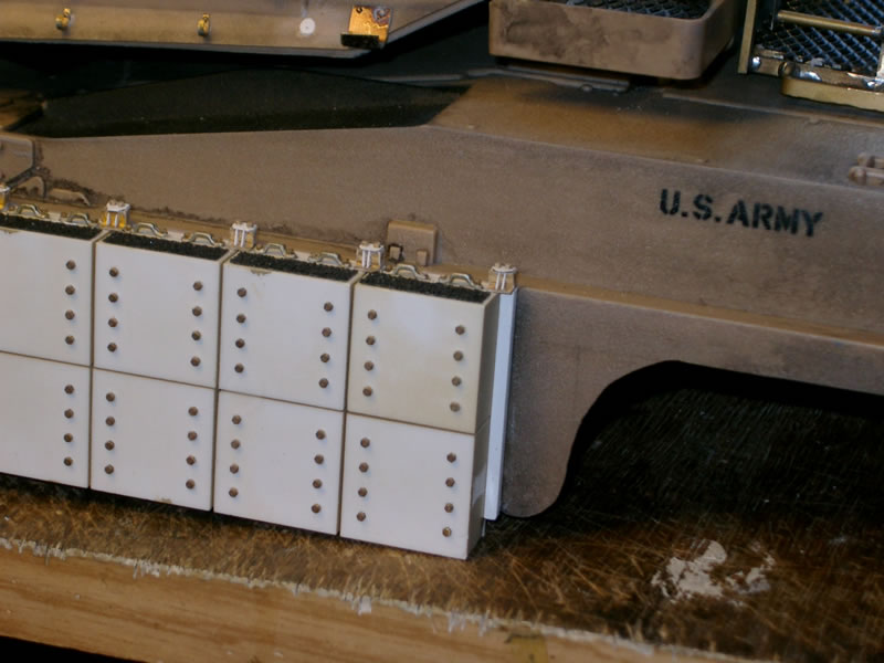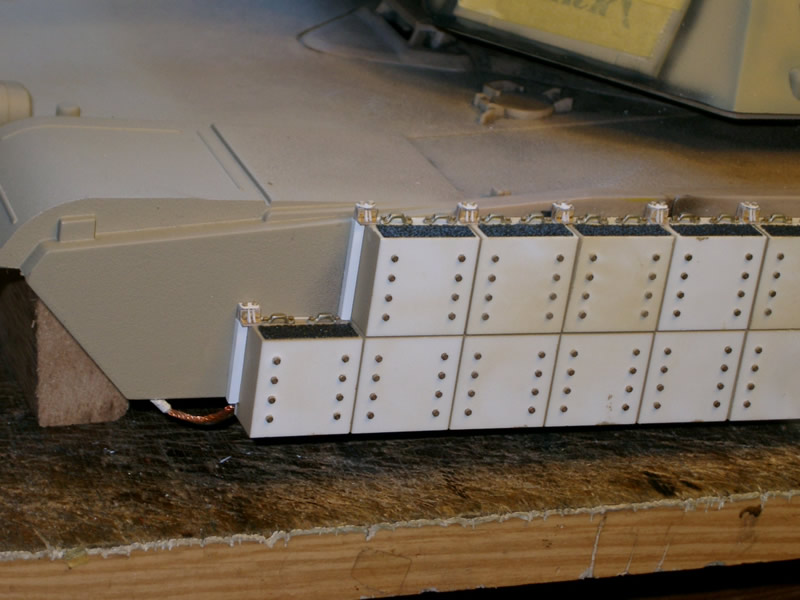 Aber der war auch nur Lückenfüller, hauptsächlich habe ich mich mit den Verriegelungen der Module der Zusatzpanzerung beschäftigt. Eine Heidenarbeit. Vorne sitzt ein L-Profil, hinten ein U-Profil. Zusätzlich zwei kleine Versteifungen aus Poly angeklebt, ebenso die obere Abdeckung. Die beiden Schrauben sind nur Dummys. Zuerst hatte ich versucht, zumindest teilweise Muster in Resin abzugießen. Sah alles nicht aus, also 34 Stück händisch gebaut. Das zieht sich doch etwas hin...