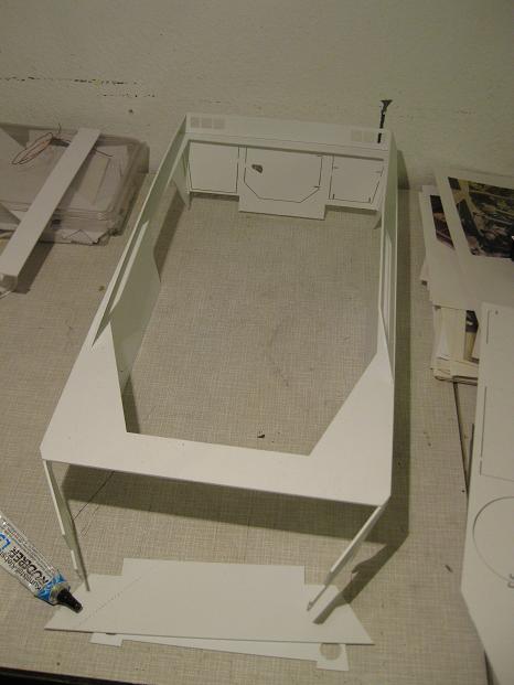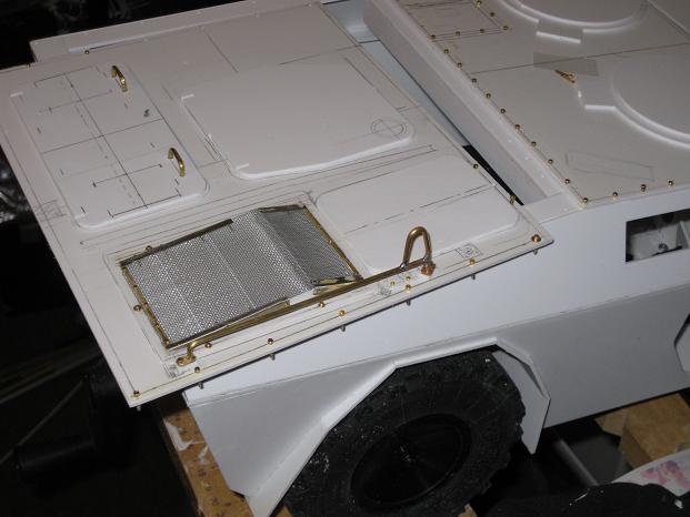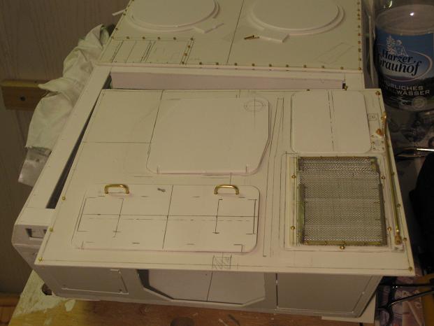 Da ich über keinerlei Zeichnungen des Fennek verfüge und die "scalizität" der Basis bezweifle muß die Referenz der Schrauben her. Auf den Fotos zählen, wieviel Schrauben in gewissen Bereichen sitzen, umrechnen und anhand der Abstände der Schrauben versuchen, die Klappen etc. zu einem einigermaßen stimmigen Modell zusammenzubringen.