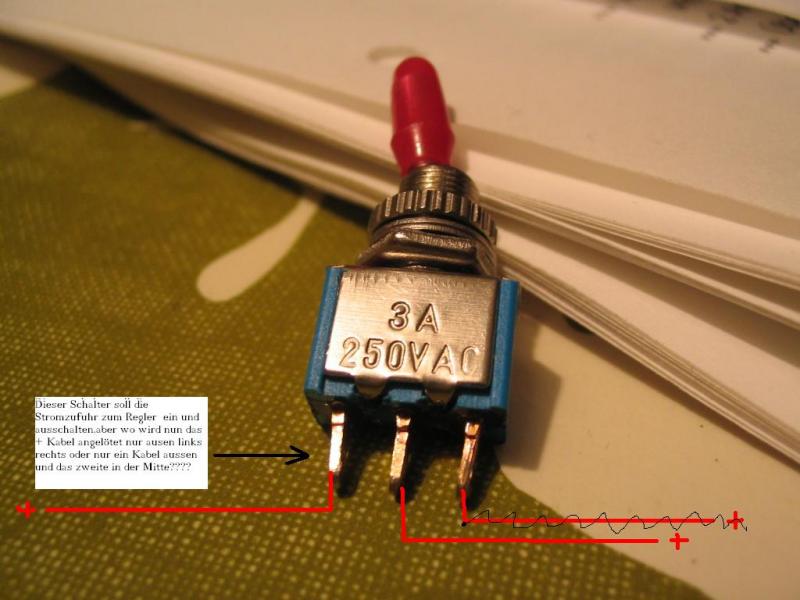 ich brauche mal kurz hilfe vom Elektrofachmann bin leider unwissend bezüglich der Elektrik . Und zwar habe ich wie auf dem Bild zu sehen ein Schalter gekauft der zwischen Regler und Batterie eingebaut werden soll nur hat der Schalter drei anlötstellen wo genau muß ich denn nun die Kabel anlöten wer kann mir da helfen? sicher für einige von euch Lachhaft aber ich kenne mich nicht aus und möchte den teueren Regler nicht zerstören