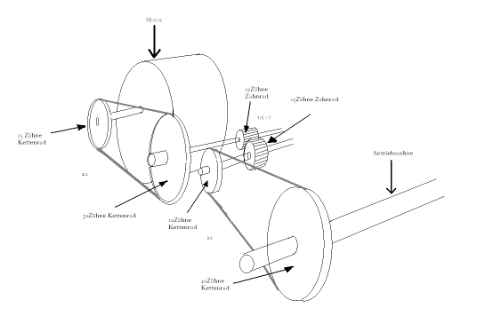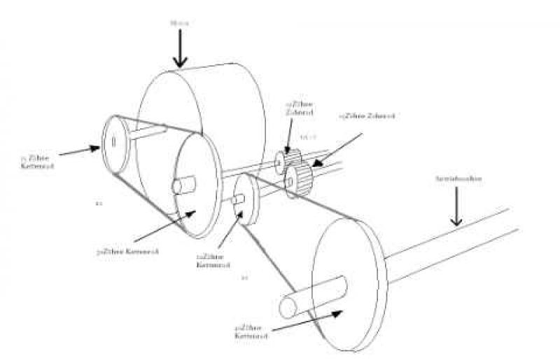 9. Das Getriebe mit der Untersetzung 7:1 sollte auf Wunsch mit schon vorhandenen Rollenketten und Kettenrädern aufgebaut werden. Hier interessiert jetzt nur noch die Aufteilung der Abstufungen, die bauliche Lösung überlasse ich dem Modellbauer.