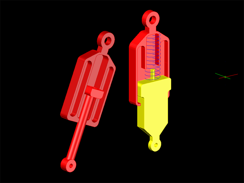 Links sieht man den Platzhalter rechts das Schnittmodell des Stossdämpfers der nun zum Einsatz kommen soll. Die Kanten werden alle noch gerundet usw, aber ich denke, man kann schon erkennen was es werden soll. Ob der Federweg so ausreicht wag ich zu bezweifeln, aber jetzt fräs ich erstmal ein Teil und dann schaumermal.