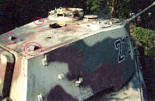 2) Drei angeschweißte Haltepunkte, jeweils einer vor und einer hinter der Kommandantenkuppel und einer zwischen der Selbstverteidigungswaffe und der Einstiegsluke des Ladeschützen.