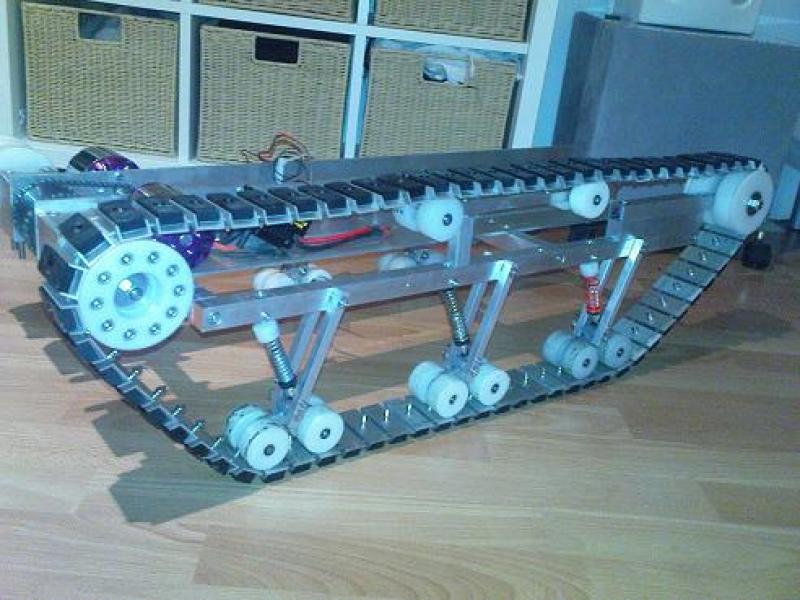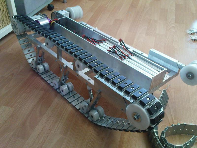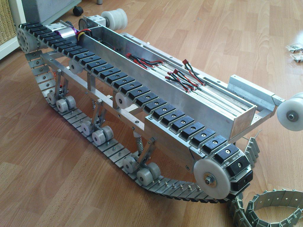 POM für die Kettenpolster zu nehmen, hat schon einen Hintergrund. Die Kettenglieder sind auf Drahtseile geschoben und mit den "Polstern" geklemmt. Das würde mit Gummi nicht funktionieren. Die ersten Tests (mit einer Kette) im Garten hat die Konstruktion mit Bravour bestanden. Als Antriebe sind 2 Brushless Motoren mit jeweils (max.) 2500Watt verbaut.