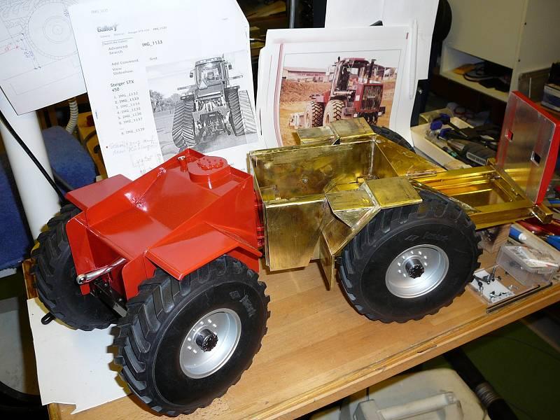 So baue ich momentan in 1:10 an einem Knicklenker-Großtraktor aus den USA, der nicht nur mit 1,6m großen Rädern fährt, sondern auch mit vier Raupenlaufwerken ausgerüstet werden kann. Das hat mich - zugegeben - besonders daran gereizt.
