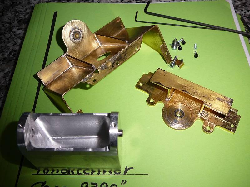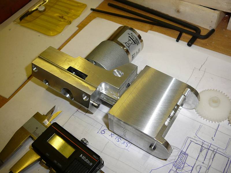 Das Gehäuse für die Zahnräder des Poti-Antriebs ist gleichzeitig das tragende Rahmenteil für die Gelenkzapfen, wobei das vordere Teil für die Lenk-Gelenkzapfen getrennt gefertigt wurde, weil es so besser ausgehöhlt werden konnte.