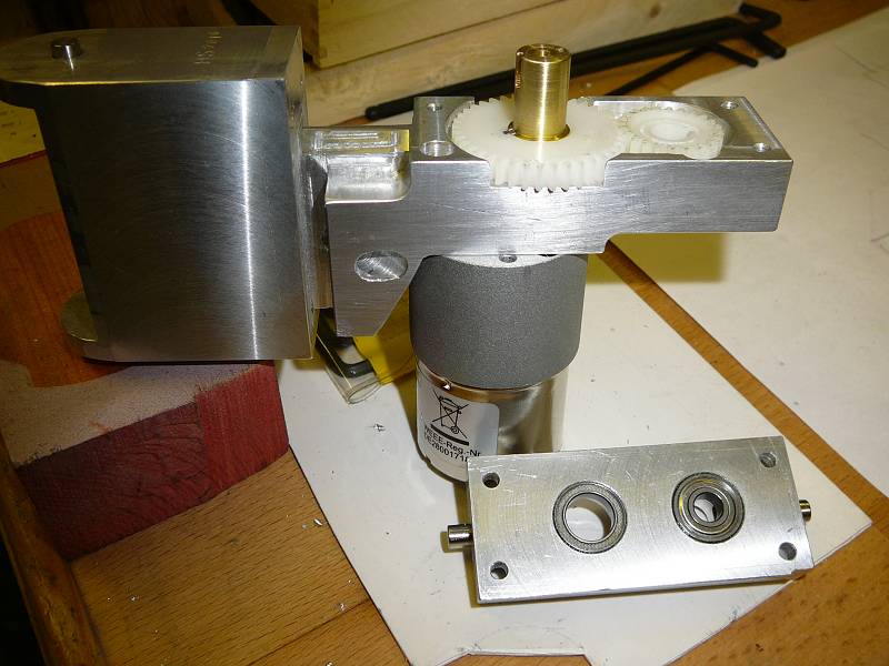Da kein nennenswertes Drehmoment vorkommt, genügen die zufällig passenden Delrin-Zahnräder zur Potibewegung. Die Abstimmung der Zähnezahlen gestattet eine größere Bewegung am Poti. Das erhöht die Stellgenauigkeit und vermindert den Einfluß des unvermeidlichen Getriebe-Spiels im Getriebemotor. Die Übertragungs-Zahnräder sind so genau plaziert, dass dort kein Spiel auftreten kann. Ebenso wird in diesem Sinne die Momentübertragung durch kleine Paßfedern gesichert.