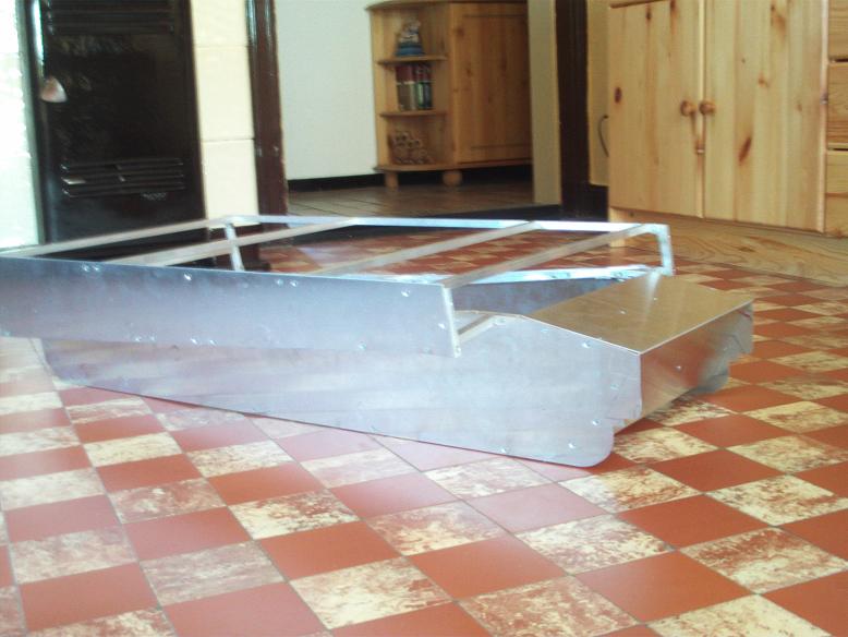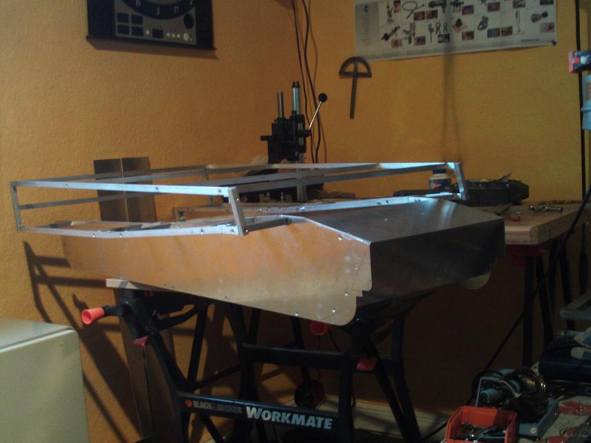 heute habe ich mal mit der "hülle" angefangen. 1,5mm dickes alu gebohrt und mit senkschrauben an das gerippe geschraubt.