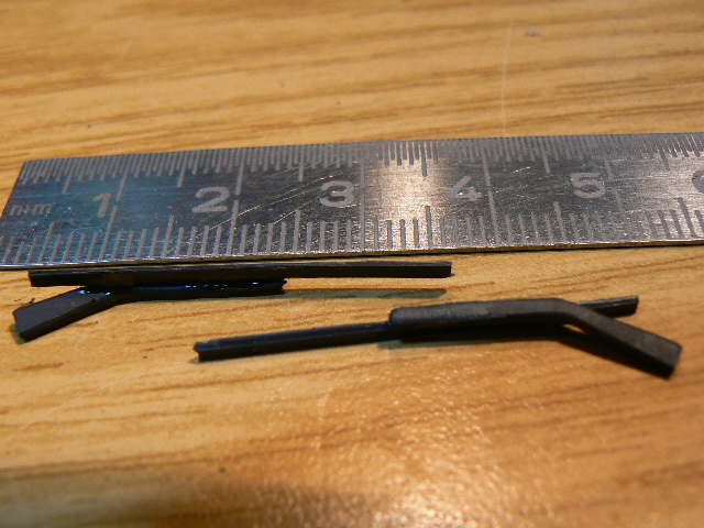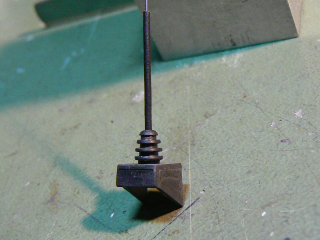 Das Blinki wird außen mit einem Gestänge gehalten. Beide Leitungen müßen durch ein kleines Röhrchen geführt werden. Um das ganze stabil zu gestalten gabs ein Röhrchen aus Kupferberyllium, 2,5 x 0,2mm. Unten an der Karosse wird mit einer aufgebohrten Augenschraube gehalten.