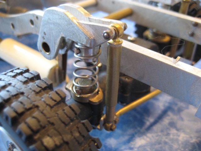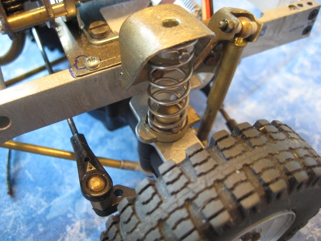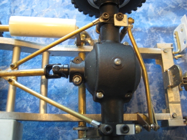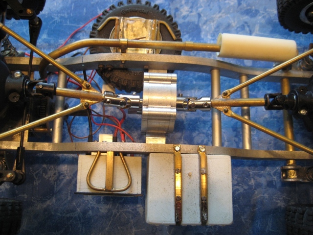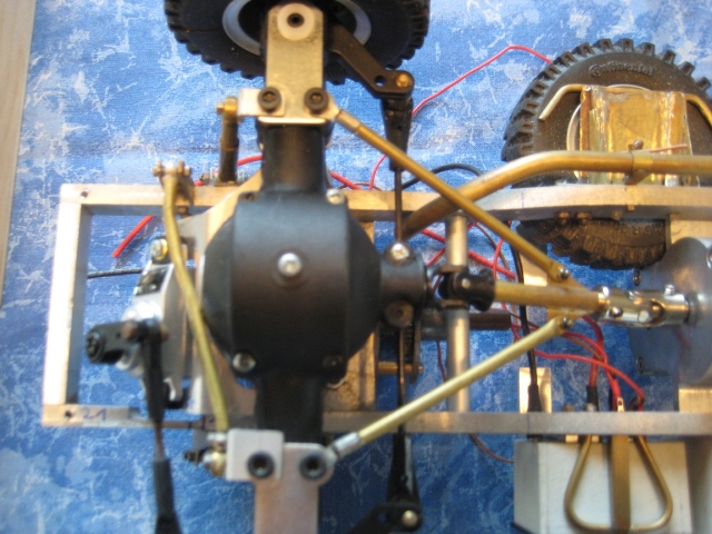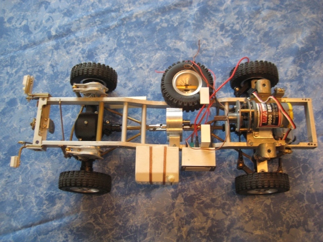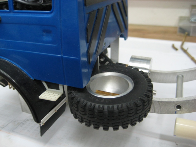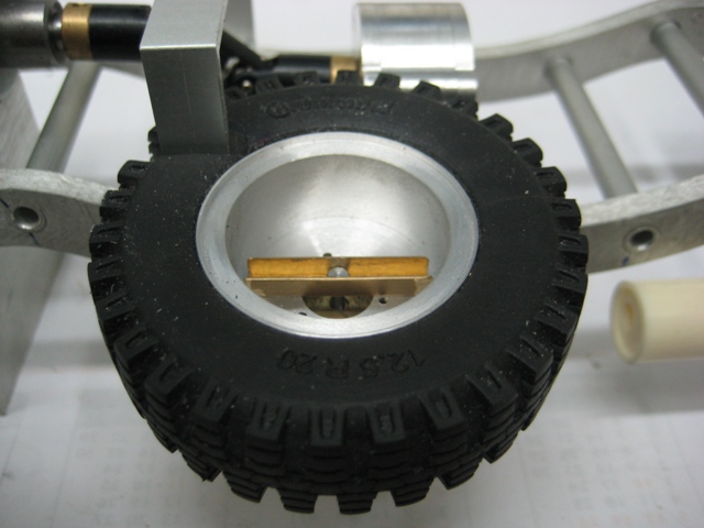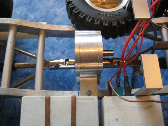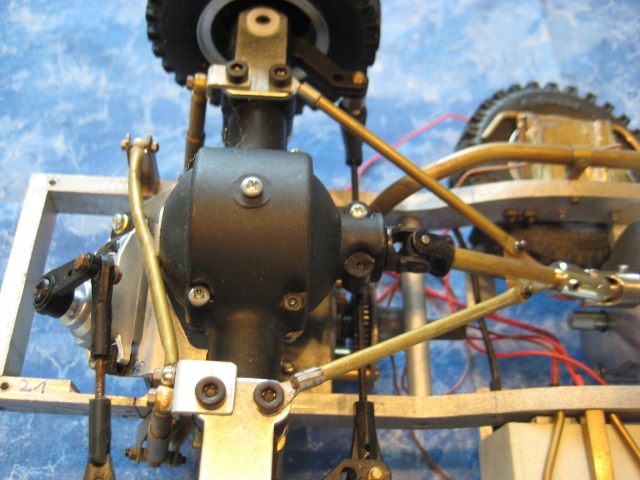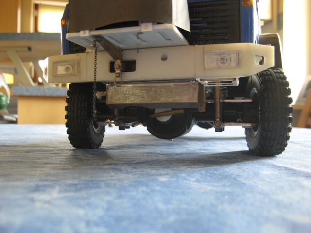 Noch ein Tip: Bei den kleinen Reifen solltest Du die Achsgehäuse noch etwas abflachen unten. Das bringt nochmal gute 5 mm mehr Luft zwischen den Rädern. Einfach das Gehäuse bis zur Schmerzgrenze abschleifen (checken mit großen Kegelrad am Diff) und ne 1er Aluplatte dann wieder drannsetzen. Fertig.