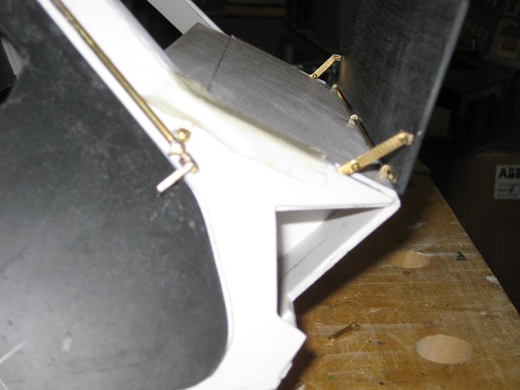 Zum Aufrichten muß nun ein Seil unterhalb des Schwallbretts an der Karosse fest gemacht werden...über eine kleine Umlenkrolle auf dem Federstahl endet das andere Ende auf dem oberen Brett.
