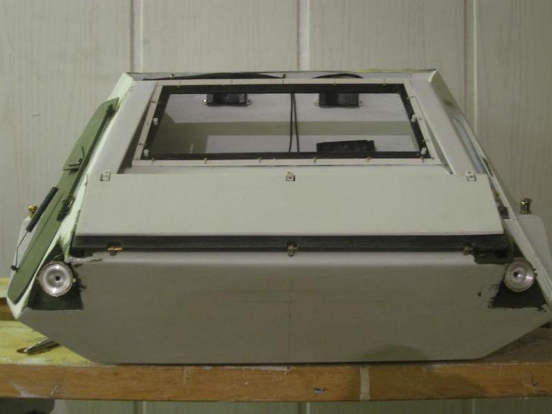 So, die Karosse steht! Das Dach und die Seitenwände sind dran. Das Dach liegt in einem Rahmen aus MS- L- Profilen und ist komplett abnehmbar. Ob das so bleibt wird man sehn- hängt davon ab, ob es erforderlich ist (Motore/ Achsen?) und wie es sich mit den Details "versteift". Momentan is das alles noch n bischen labberig.... aber das wird und ich komme jetzt endlich in die Phase, die mir persönlich immer am meisten Spaß macht---- Details.....