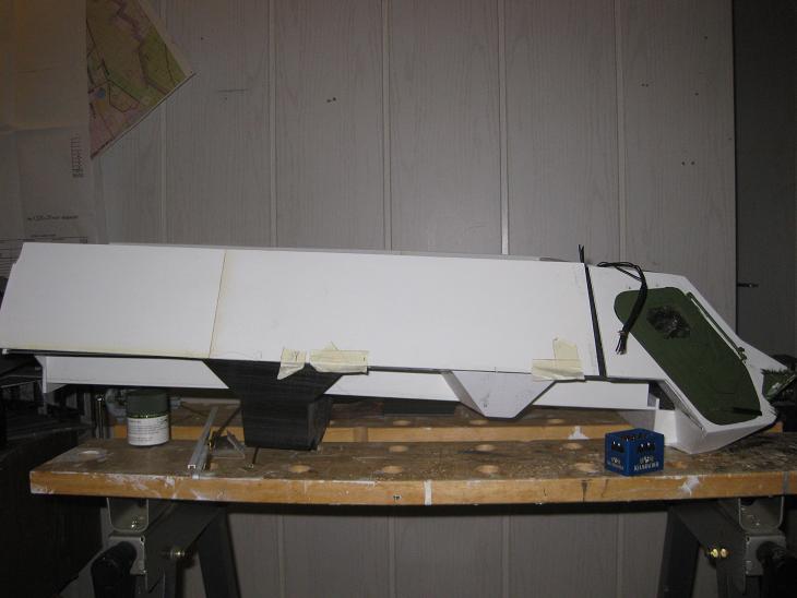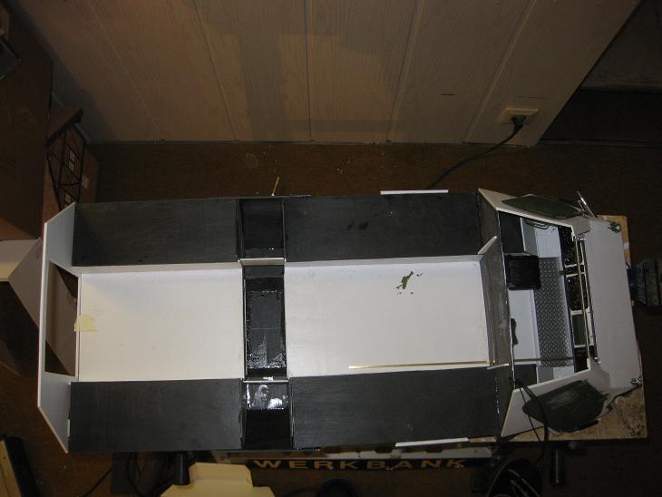 Hier ein Update vom letzten Projektstand. Mittlerweile wieder die "Langversion", das Heck und die Seitenwände nur provisorisch angelehnt. Jetzt erkennt man wieder, wie lang das Modell wieder.