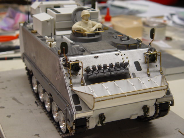 Heute stelle ich mal die neusten Bilder meines aktuellen Projektes vor. Es handelt sich um einen M113. Als Basis dient das Fahrwerk von Peter Müller (Lieferzeit 1 Woche). Der Rest ist bis auf die Nebelbecher aus Poly und Messing Restbeständen frei Hand geschnitzt wurden. Noch fehlen viele Kleinteile