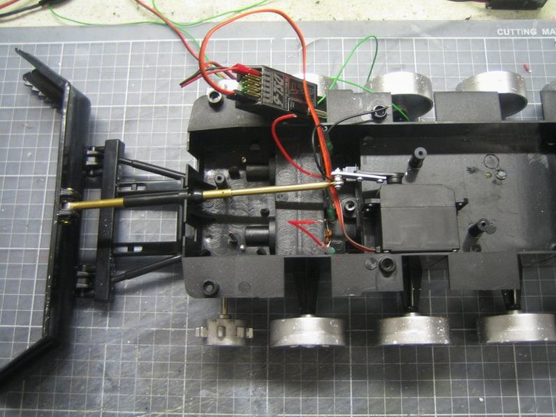 Zur Zeit ist es erstaunlicher Weise so, dass durch den verlängerten Servoarm und die Bedienung des Servo´s, sich die Schaufel anheben und dann ein wenig nach hinten in Richtung Führerhaus gekippt wird.kippen läßt